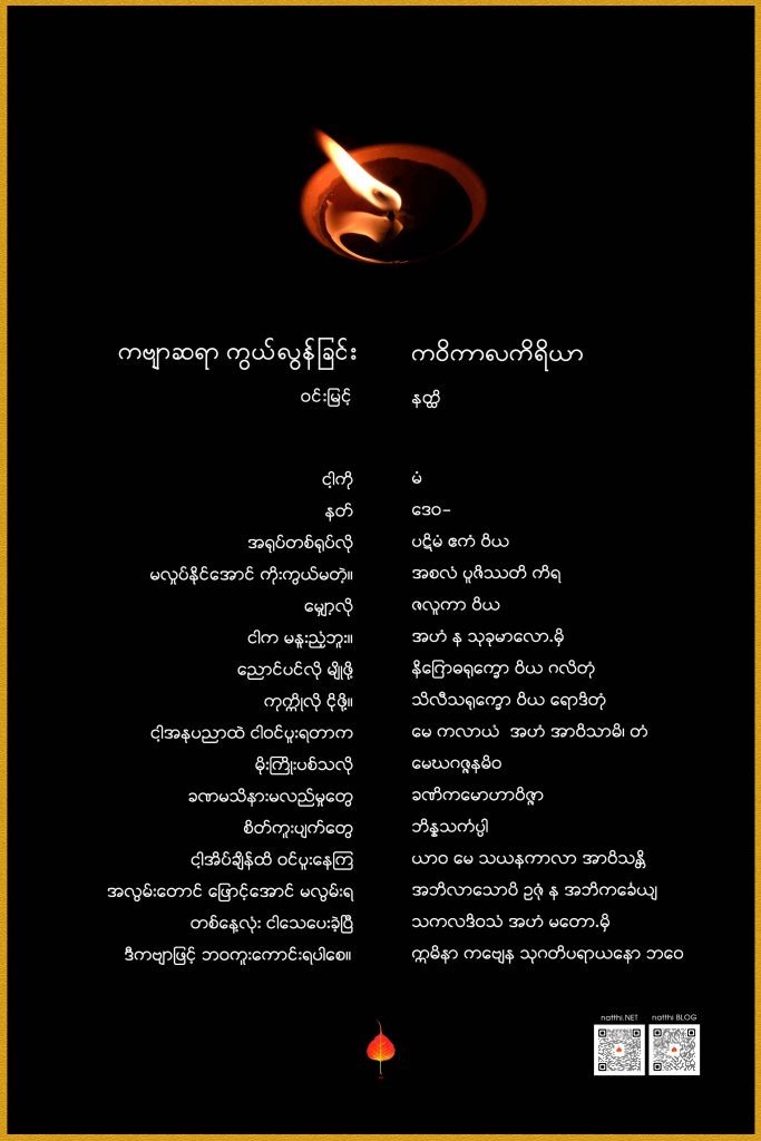Myanmar Poem, Poetry, Translation ဝင်းမြင့် – ကဗျာဆရာ ကွယ်လွန်ခြင်း – ပါဠိ February 16, 2026 / Comments Off on ဝင်းမြင့် – ကဗျာဆရာ ကွယ်လွန်ခြင်း – ပါဠိ ကဗျာဆရာ ကွယ်လွန်ခြင်းဝင်းမြင့်ပါဠိဘာသာပြန် – နတ္ထိ